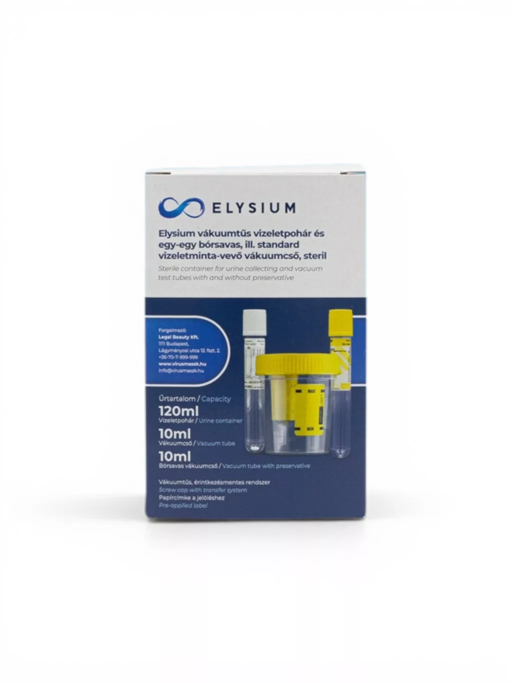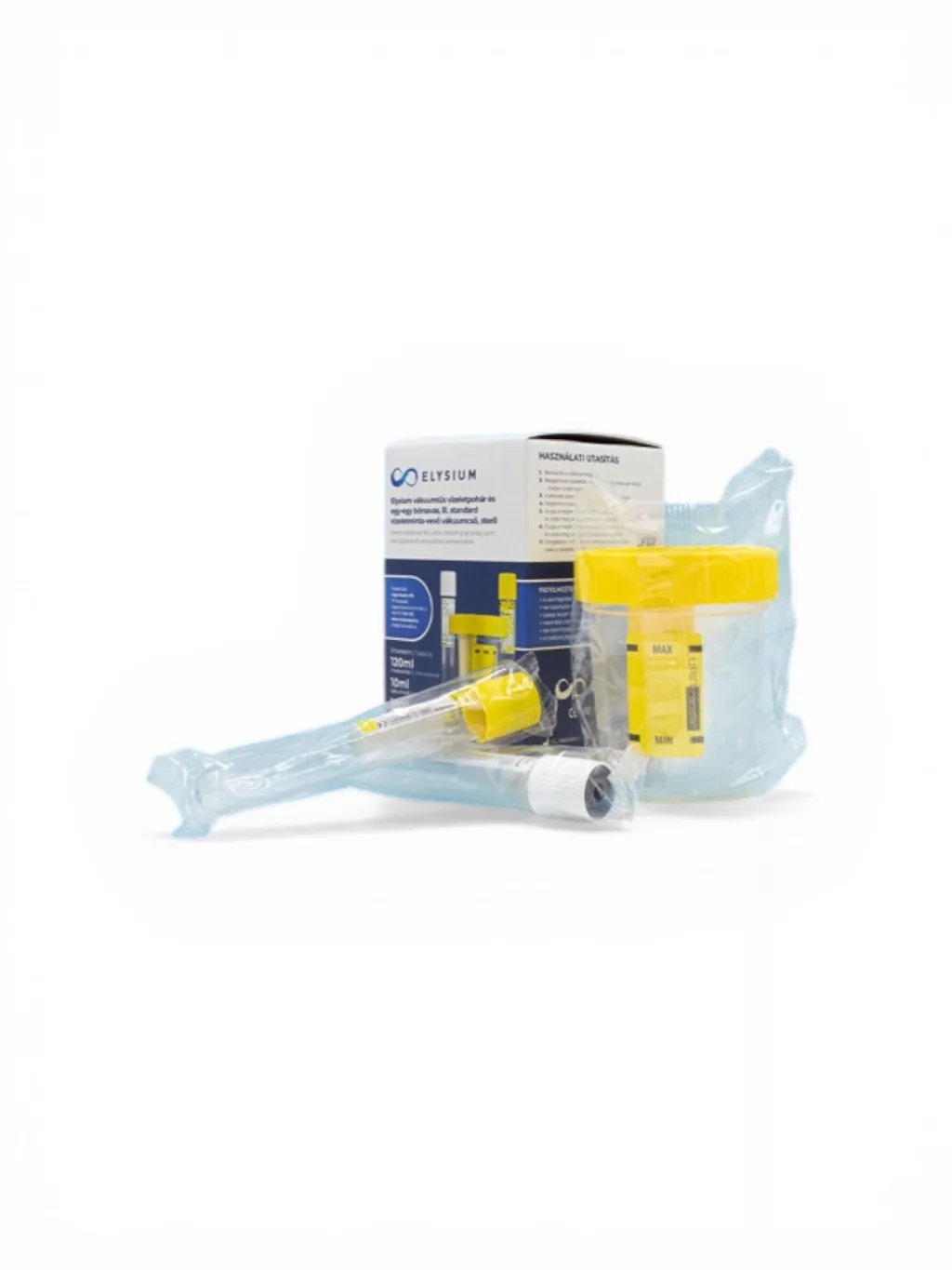 A termék megnevezése: Elysium vákuumtűs vizeletpohár és egy-egy bórsavas, illetve standard vizeletminta-vevő vákuumcső, steril